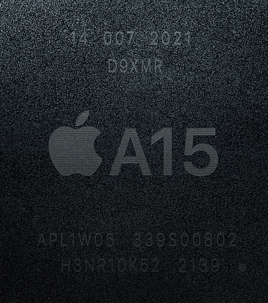 - A15 바이오닉은 A14 바이오닉과 동일한 5나노미터 공정으로 생산되었습니다. 트랜지스터 수는 A15 바이오닉 150억 개, A14 바이오닉 118억으로 약 27% 더 증가되었습니다. A14 바이오닉 칩셋은 2코어 빅 클러스터(Firestorm)와 4코어 리틀 클러스터(Icestorm)으로 구성되어 있습니다.