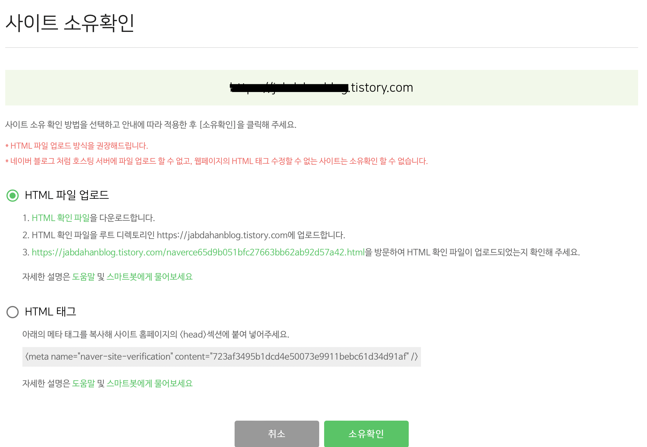 4. 이제 사이트 소유확인(html 파일 업로드 또는 html 태그)만 하면 끝납니다. 저는 html 태그 방식으로 진행하였고, meta 태그를 집어넣는 방법은 '구글 서치 콘솔 가이드' 포스팅을 참고해주세요.