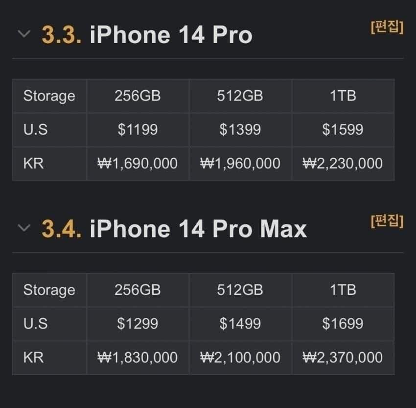 - 아이폰 14 PRO MAX의 저장 용량은 256GB, 512GB, 1TB 로 예상되며, 가격은 1,299 달러(약 1,830,000원)에서 시작할 것이라고 예상됩니다.