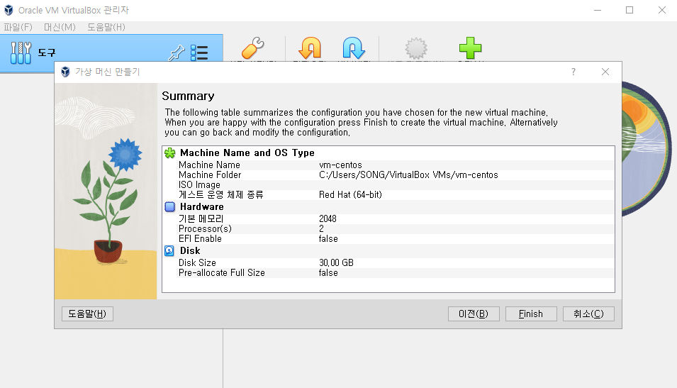 하드웨어 설정을 해야하는데 저는 메모리 2GB, 프로세서 2개, 저장공간은 30GB로 잡아주었습니다. 프로세서는 문제가 될 수 있으니 꼭 2개 이상으로 잡아주세요.