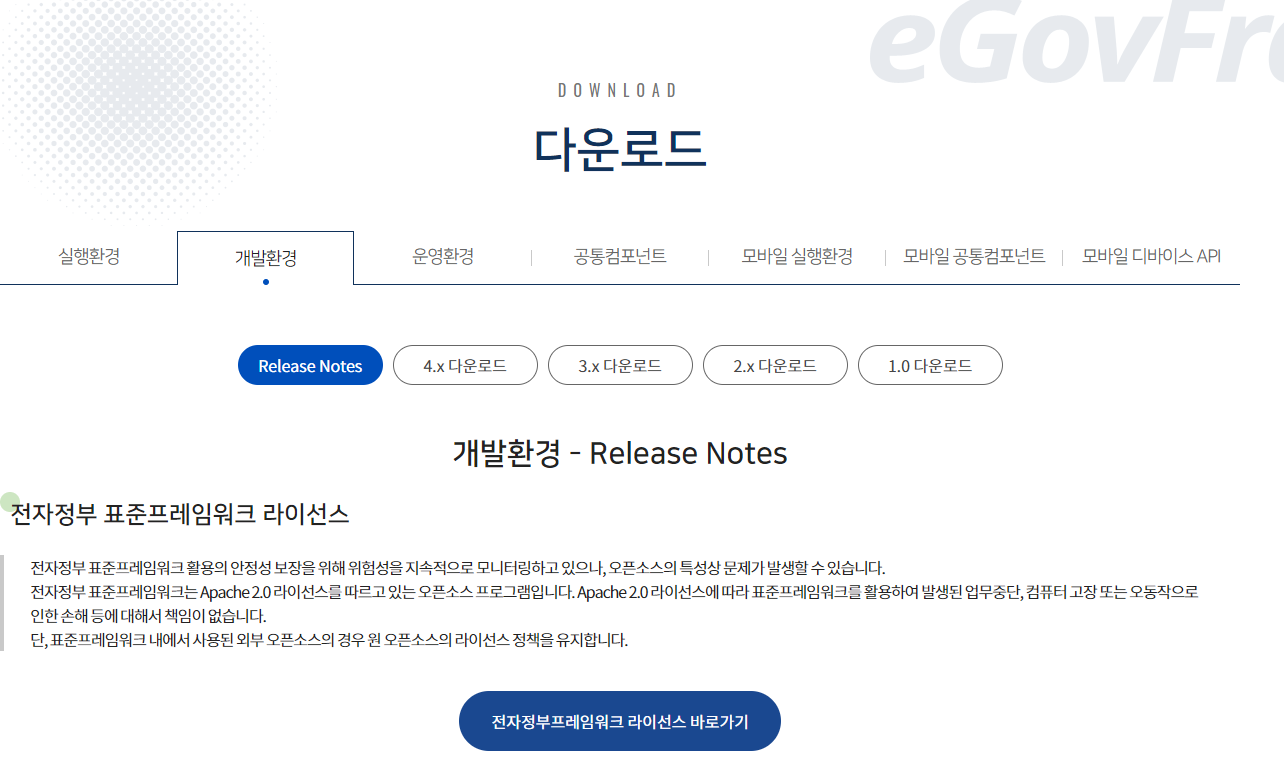 전자정부프레임워크 설치 방법을 알아보았습니다. 최신 릴리즈 4.x 버전도 여기도 동일한 방법으로 다운로드하실 수 있습니다.
