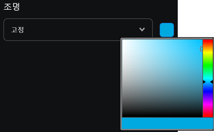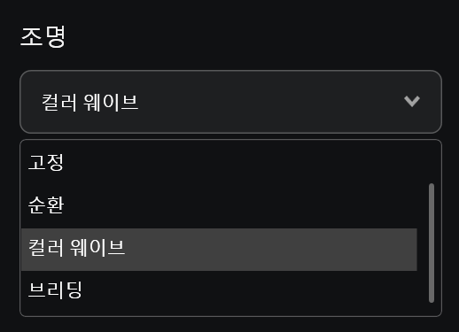 마우스 LED 설정도 할 수 있습니다. 설정은 끄기, 고정, 순환, 컬러웨이브, 브리딩 등으로 다양하게 할 수 있습니다. 고정은 다양한 RGB 컬러 중 선택할 수 있습니다.